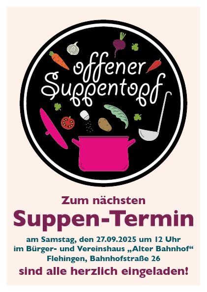 Am Samstag, 27.09.2025 findet der nächste kostenlose offene Suppentopf statt. Ab 12:00 Uhr gibt es Suppe im Bürger- und Vereinshaus “Alter Bahnhof” in Flehingen., Bahnhofstr. 26